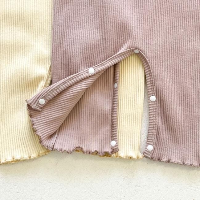 肩のフリルがさりげないポイント!優しいカラーのロンパースです。