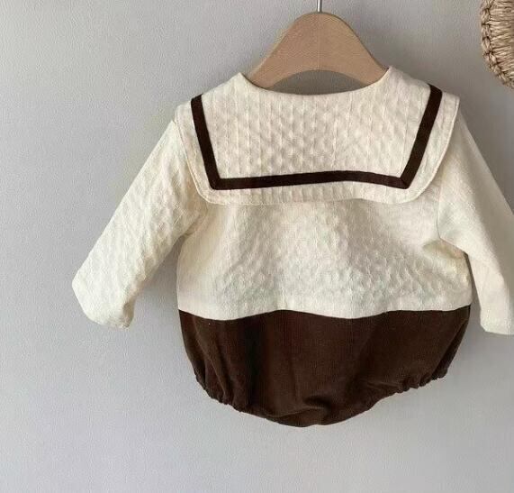 セーラー服のような襟が可愛らしいクラシカルなロンパース。